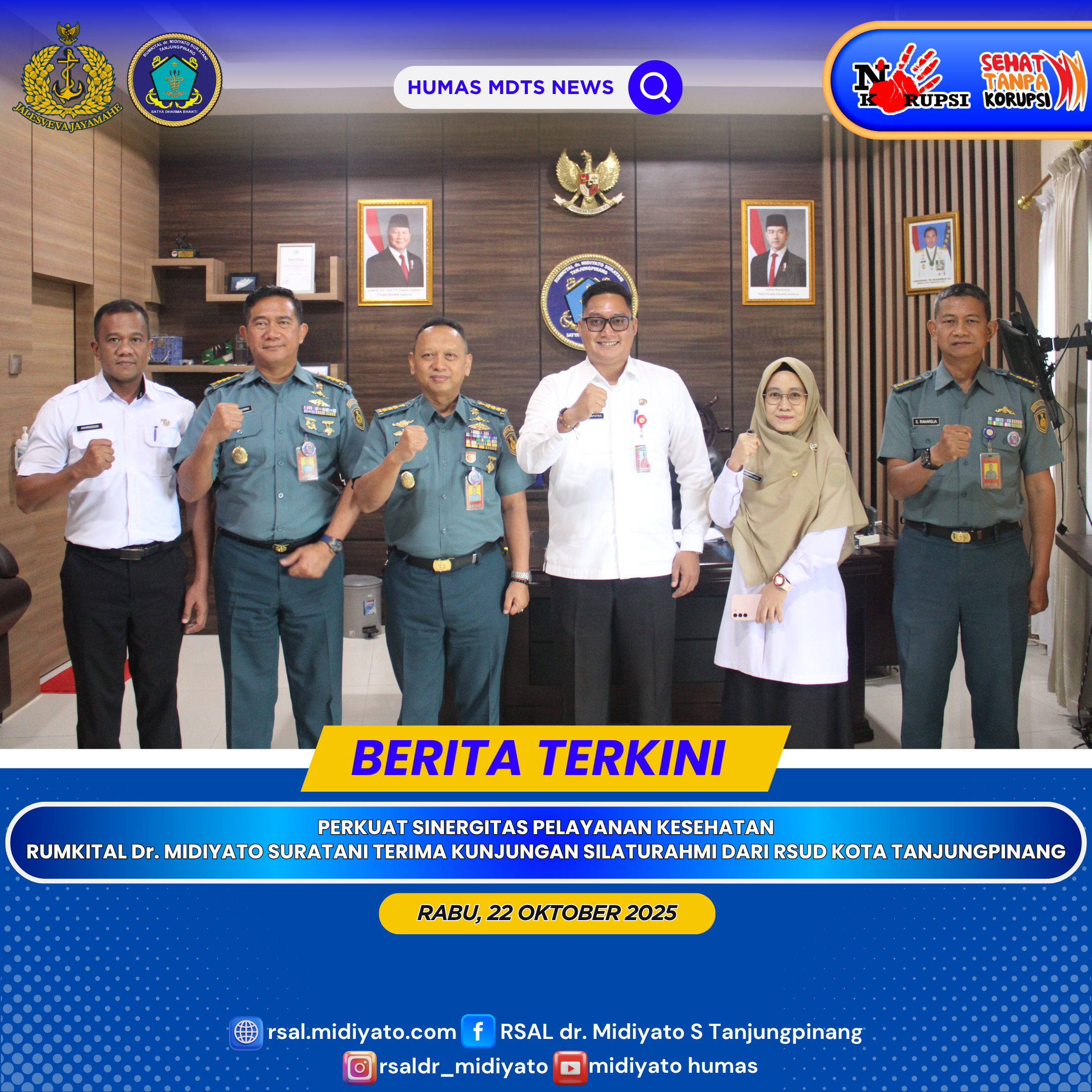 TNI Angkatan Laut. Karumkital Dr. Midiyato Suratani Kolonel Laut (K) dr. Widya Wirawan, Sp.PD., M.H., FINASIM., menerima kunjungan silaturahmi dari RSUD Kota Tanjungpinang, bertempat di Ruang Kerja Karumkital Dr. Midiyato Suratani, Tanjungpinang, Provinsi Kepri. Rabu (22/10/2025) Kunjungan ini bertujuan untuk mempererat hubungan kelembagaan serta meningkatkan sinergitas dan kolaborasi antara kedua instansi dalam memberikan pelayanan kesehatan […]