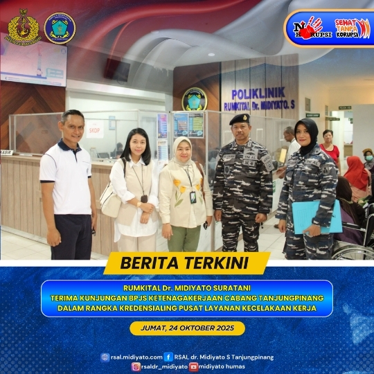 TNI Angkatan Laut. Rumah Sakit Angkatan Laut (Rumkital) Dr. Midiyato Suratani menerima kunjungan kerja dari BPJS Ketenagakerjaan Cabang Tanjungpinang dalam rangka pelaksanaan Kredensialing Pusat Layanan Kecelakaan Kerja di lingkungan rumah sakit. Kegiatan berlangsung di Poliklinik VIP Rumkital Dr. Midiyato Suratani, Tanjungpinang, Provinsi Kepri. Jumat (24/10/2025) Kunjungan kerja tersebut diterima oleh Kadep KIA/Ka. UPKP Kolonel Laut […]