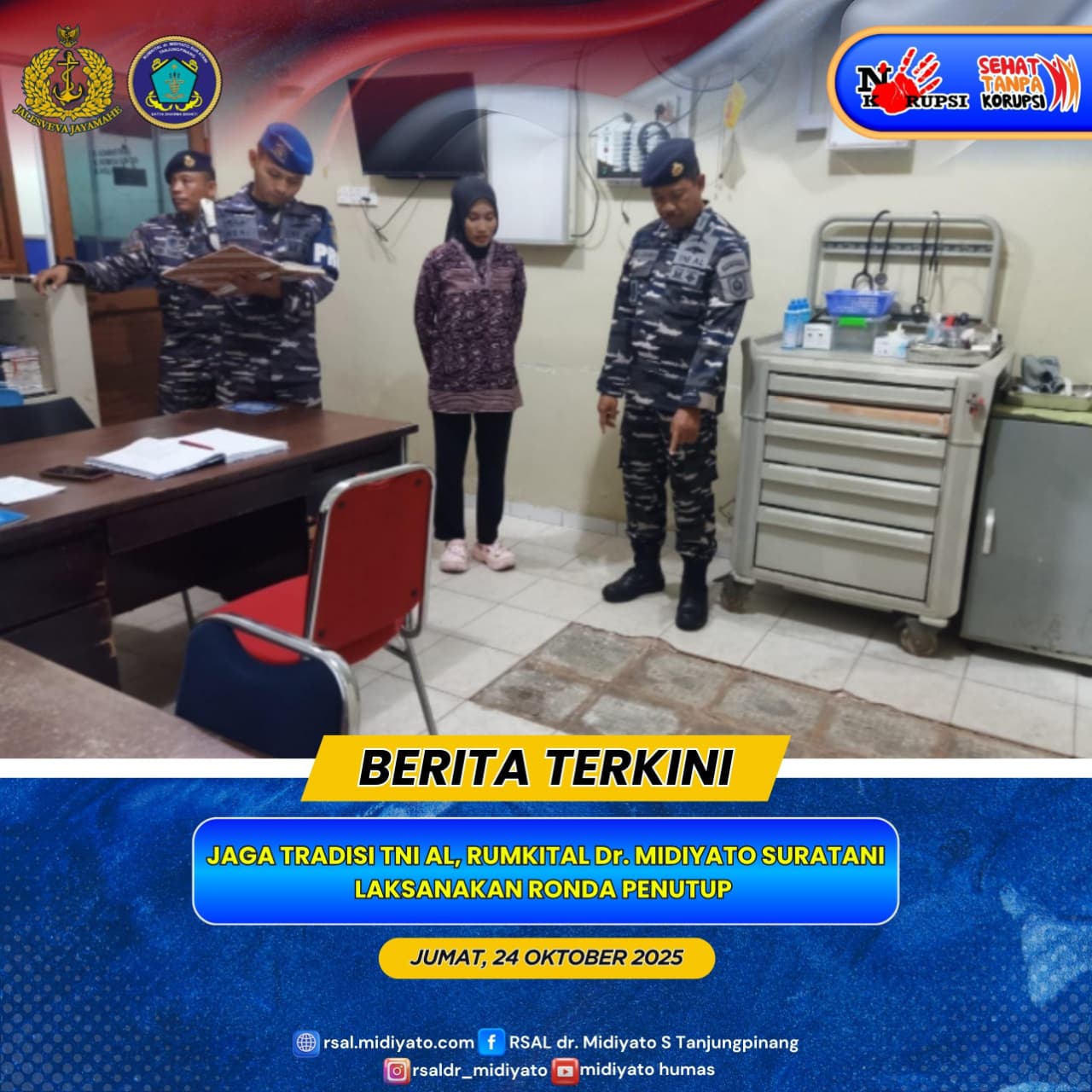 TNI Angkatan Laut. Dalam rangka memelihara tradisi TNI Angkatan Laut, Rumkital Dr. Midiyato Suratani menerapkan Peraturan Dinas Dalam (PDD) Khas TNI AL dengan melaksanakan ronda penutup di lingkungan Rumkital Dr. Midiyato Suratani, Tanjungpinang, Provinsi Kepri. Jumat (24/10/2025) Kegiatan ronda penutup yang digelar pada hari ini dipimpin oleh Kadep KIA Kolonel Laut (K) Budi Gunawan, serta […]