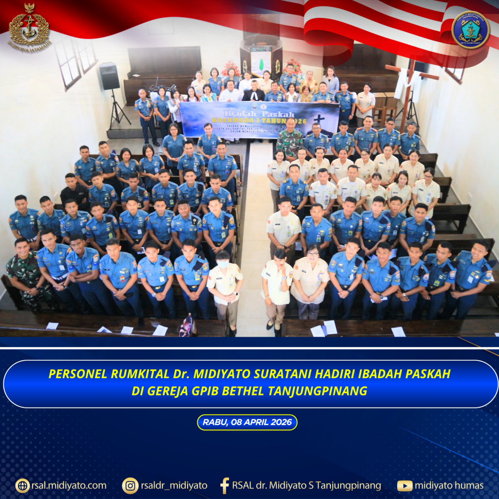 TNI Angkatan Laut. Personel Rumkital dr. Midiyato Suratani yang beragama Nasrani turut menghadiri kegiatan ibadah Perayaan Paskah tahun 2026 yang diselenggarakan oleh Koarmada I, bertempat di Gereja GPIB Bethel Tanjungpinang, Provinsi Kepri. Rabu (08/04/2026)