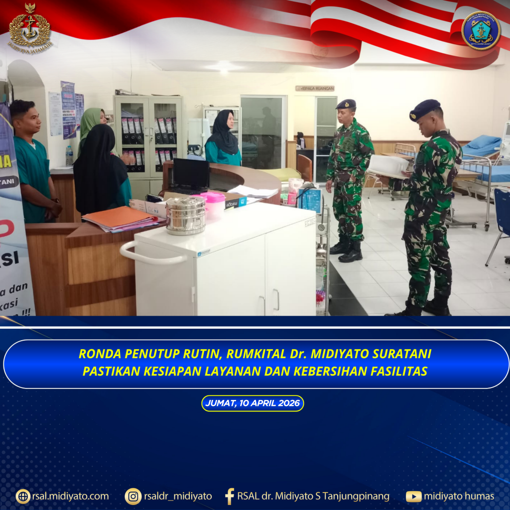 TNI Angkatan Laut. Rumkital dr. Midiyato Suratani melaksanakan kegiatan ronda penutup sebagai bagian dari rutinitas mingguan dalam menjaga kualitas pelayanan dan kesiapan fasilitas rumah sakit. Jumat (10/04/2026)