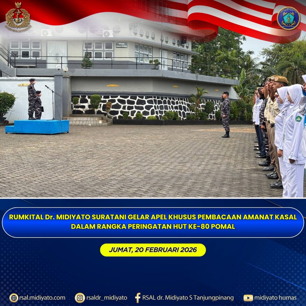TNI Angkatan Laut. Rumkital dr. Midiyato Suratani melaksanakan Apel Khusus dalam rangka memperingati Hari Ulang Tahun (HUT) ke-80 Polisi Militer Angkatan Laut (Pomal) Tahun 2026, bertempat di Lapangan Apel Rumkital dr. Midiyato Suratani, Tanjungpinang, Provinsi Kepri. Jumat (20/02/2026)