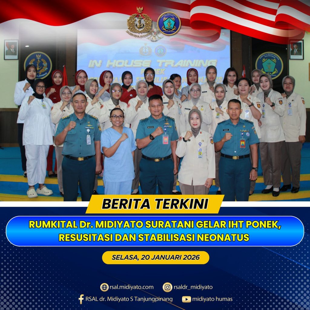 TNI Angkatan Laut. Rumkital dr. Midiyato Suratani melaksanakan kegiatan In House Training (IHT) PONEK, Resusitasi dan Stabilisasi Neonatus Bagi Tenaga Kesehatan Rumkital dr. Midiyato Suratani Tahun 2026, bertempat di Gedung Serba Guna (GSG) Pulau Serasan Rumkital dr. Midiyato Suratani, Tanjungpinang, Provinsi Kepri. Selasa (20/01/2026)