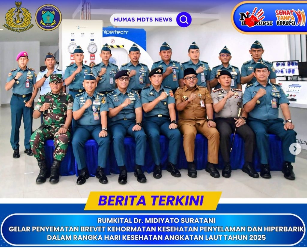 TNI Angkatan Laut. Dalam rangka memperingati Hari Kesehatan Angkatan Laut tahun 2025, Rumah Sakit Angkatan Laut (Rumkital) Dr. Midiyato Suratani melaksanakan Acara Penyematan Brevet Kehormatan Kesehatan Penyelaman dan Hiperbarik. Kegiatan dipimpin langsung oleh Karumkital Dr. Midiyato Suratani Kolonel Laut (K) dr. Widya Wirawan, Sp.PD., M.H., FINASIM., dan diikuti oleh sejumlah pejabat tinggi TNI, Polri serta unsur Forkopimda Kepulauan Riau, bertempat di Ruang Hiperbarik Chamber Rumkital Dr. Midiyato Suratani, Tanjungpinang, Provinsi Kepri. Selasa (07/10/2025)