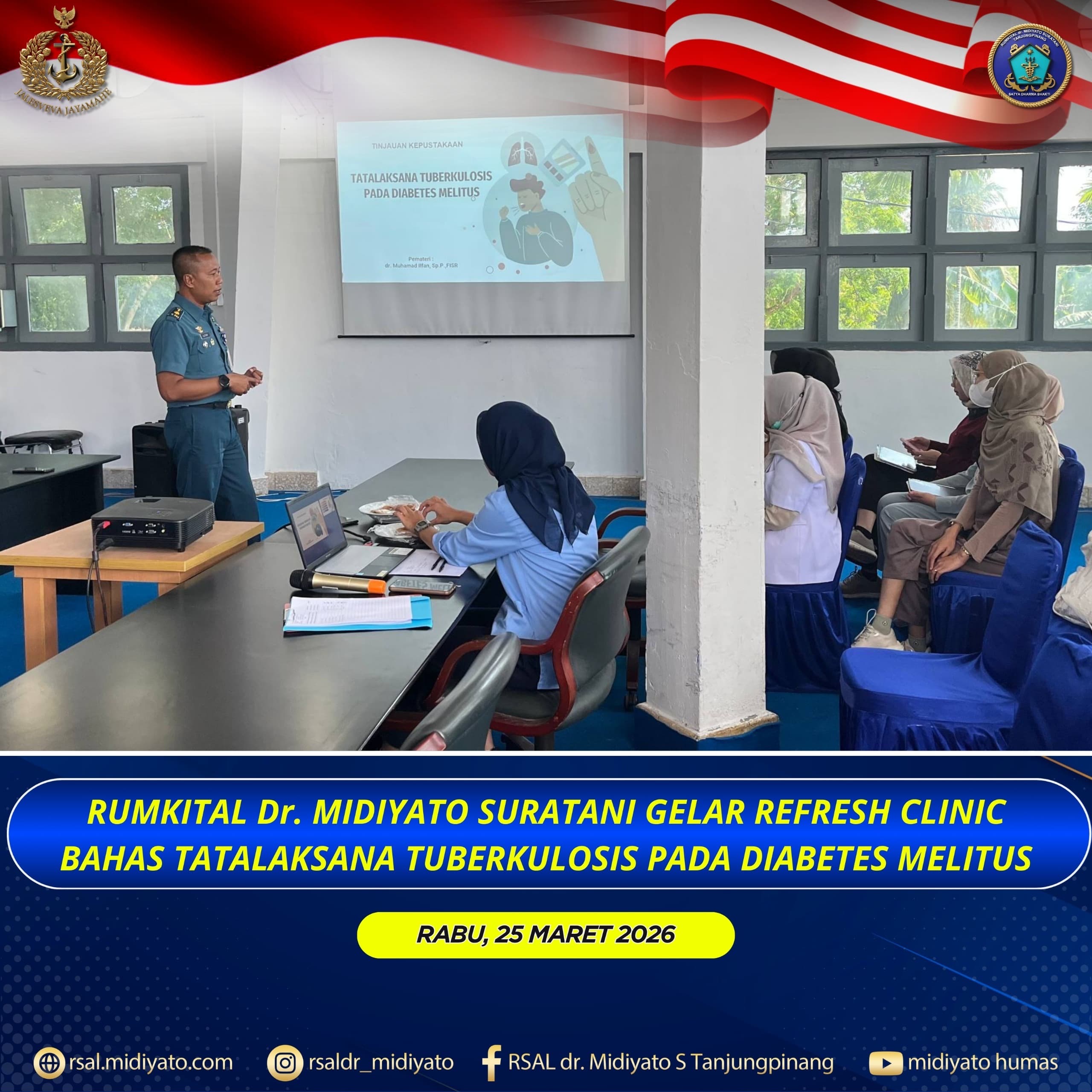TNI Angkatan Laut. Rumkital dr. Midiyato Suratani menyelenggarakan kegiatan Refresh Clinic dengan materi “Tatalaksana Tuberkulosis pada Diabetes Melitus”, bertempat di Gedung Cagar Budaya Rumkital dr. Midiyato Suratani, Provinsi Kepri. Rabu (25/03/2026)