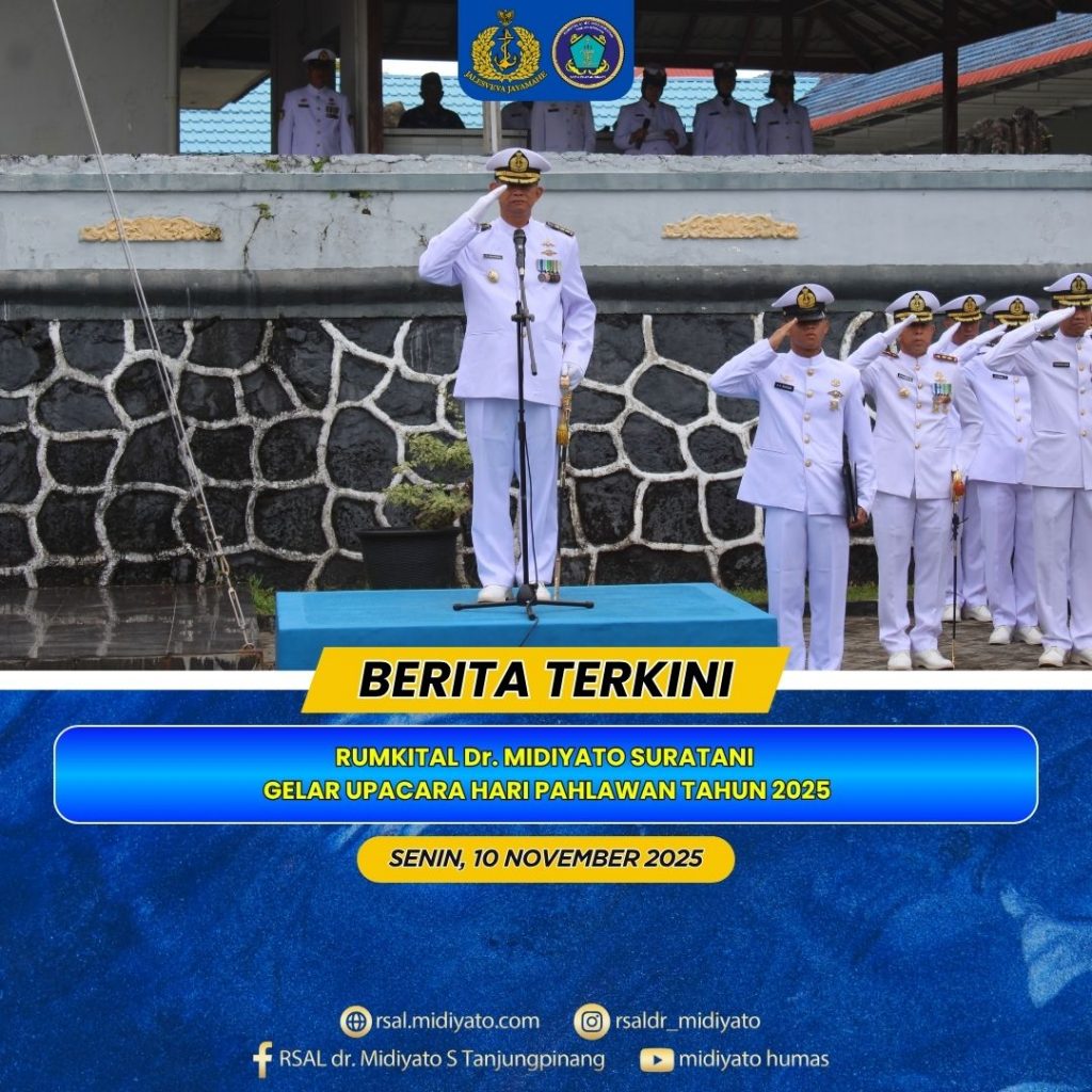 TNI Angkatan Laut. Rumah Sakit Angkatan Laut (Rumkital) Dr. Midiyato Suratani melaksanakan Upacara Bendera dalam rangka memperingati Hari Pahlawan Tahun 2025 dengan tema “Pahlawanku Teladanku, Terus Bergerak, Melanjutkan Perjuangan”, bertempat di Lapangan Apel Rumkital Dr. Midiyato Suratani, Tanjungpinang, Provinsi Kepri. Senin (10/11/2025)