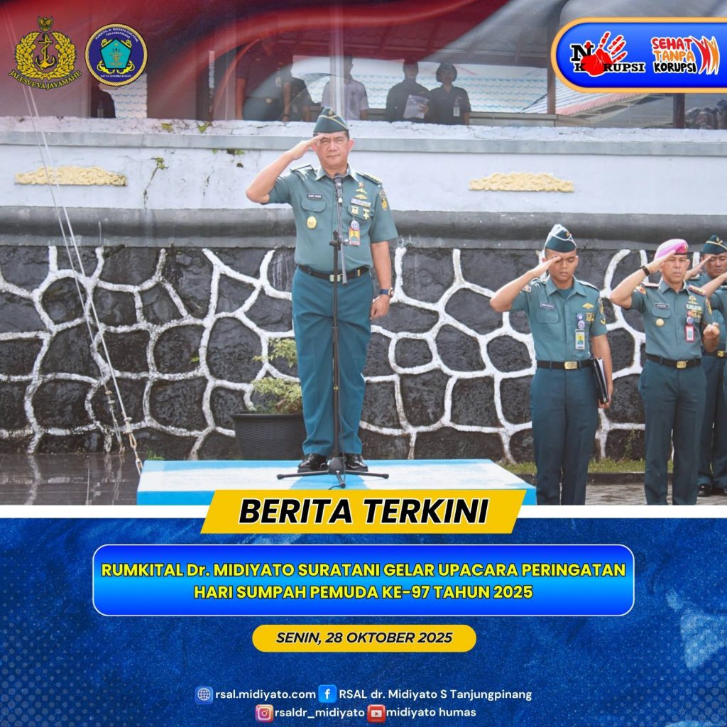 TNI Angkatan Laut. Rumah Sakit Angkatan Laut (Rumkital) Dr. Midiyato Suratani melaksanakan upacara dalam rangka memperingati Hari Sumpah Pemuda ke-97 Tahun 2025, yang mengusung tema “Pemuda Pemudi Bergerak, Indonesia Bersatu”, bertempat di Lapangan Apel Rumkital Dr. Midiyato Suratani, Tanjungpinang, Provinsi Kepri. Selasa (28/10/2025)