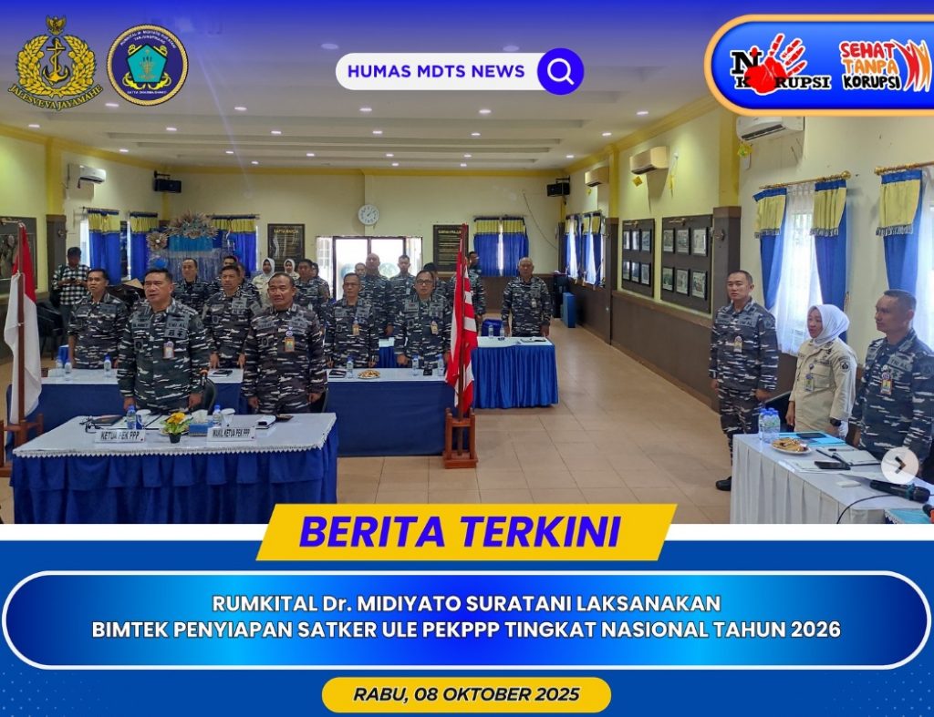 TNI Angkatan Laut. Rumah Sakit Angkatan Laut (Rumkital) Dr. Midiyato Suratani mengikuti kegiatan Bimbingan Teknis (Bimtek) Penyiapan Satuan Kerja (Satker) Unit Lokus Evaluasi (ULE) Pemantauan dan Evaluasi Kinerja Penyelenggaraan Pelayanan Publik (PEKPPP) Tingkat Nasional Tahun 2026 secara Video Conference (Vicon) yang diselenggarakan oleh Pus RB TNI, bertempat di Gedung Serba Guna (GSG) Pulau Serasan Rumkital Dr. Midiyato Suratani, Tanjungpinang, Provinsi Kepri. Rabu (08/10/2025)