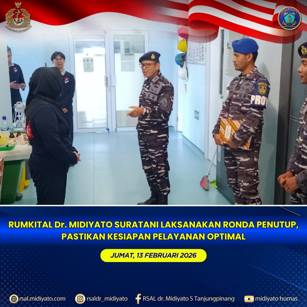 TNI Angkatan Laut. Rumkital dr. Midiyato Suratani melaksanakan kegiatan ronda penutup sebagai bagian dari rutinitas akhir pekan. Kegiatan tersebut dipimpin oleh Kabag Dokgi Umum Dep. Gilut, Letkol Laut (K) drg. Ari Onasis, Sp.Pros., serta diikuti oleh Pagatap, Bama, dan Baprov. Jumat (13/02/2026)