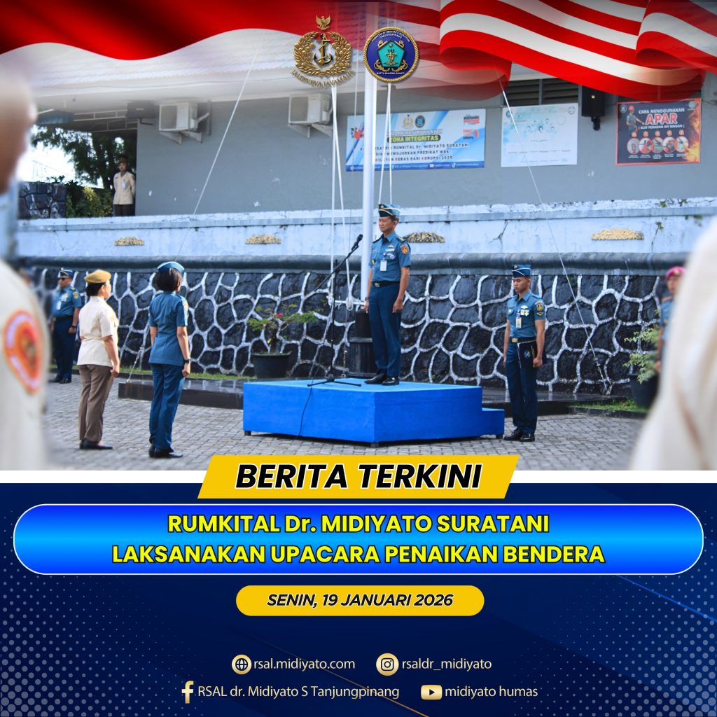 TNI Angkatan Laut. Rumkital dr. Midiyato Suratani melaksanakan Upacara Penaikan Bendera bertempat di Lapangan Apel Rumkital dr. Midiyato Suratani, Tanjungpinang, Provinsi Kepri. Senin (19/01/2026)