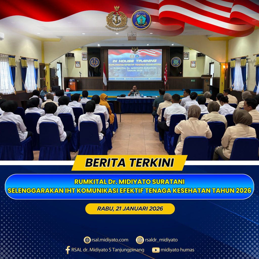 TNI Angkatan Laut. Rumkital dr. Midiyato Suratani menyelenggarakan kegiatan In House Training (IHT) Komunikasi Efektif Tenaga Kesehatan Rumkital dr. Midiyato Suratani Tahun 2026, bertempat di Gedung Serba Guna (GSG) Pulau Serasan Rumkital dr. Midiyato Suratani, Tanjungpinang, Provinsi Kepri. Rabu (21/01/2026)