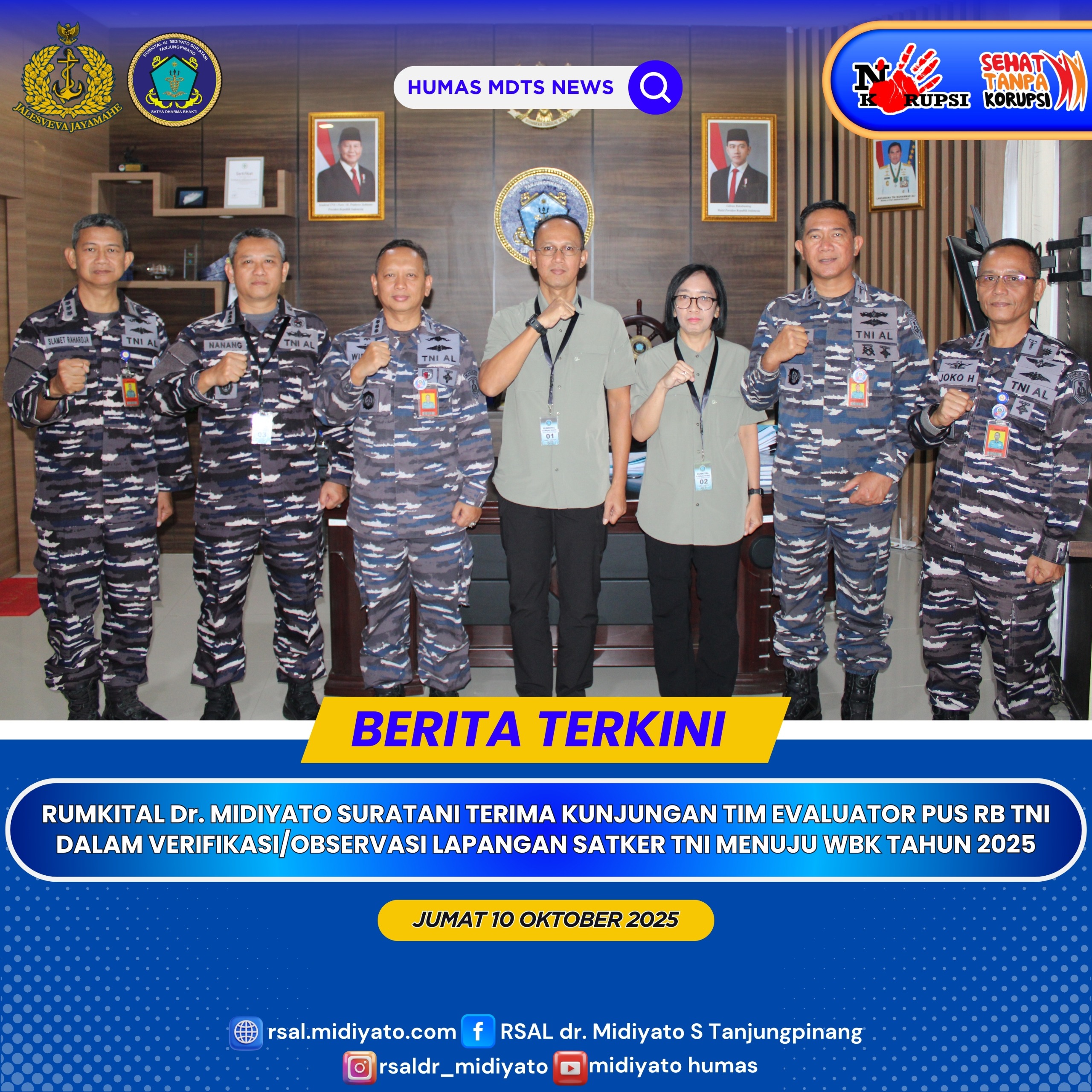 TNI Angkatan Laut. Rumah Sakit Angkatan Laut (Rumkital) Dr. Midiyato Suratani, melaksanakan kegiatan Penerimaan Tim Evaluator Pusat Reformasi Birokrasi (Pus RB) TNI dalam rangka Verifikasi/Observasi Lapangan Satuan Kerja (Satker) TNI menuju Wilayah Bebas dari Korupsi (WBK) Tahun 2025, bertempat di Rumkital Dr. Midiyato Suratani, Tanjungpinang, Provinsi Kepri. Jumat (10/10/2025)Kegiatan ini merupakan bagian dari komitmen Rumkital Dr. Midiyato Suratani untuk mewujudkan tata kelola pemerintahan yang bersih, transparan, akuntabel, serta berorientasi pada pelayanan publik yang prima. Adapun Tim Evaluator Pus RB TNI yang hadir dalam kegiatan ini antara lain, Letkol Tek Rahman S., A.Md., S.H., dan Myr Cpl (K) Made Dewi A., didampingi oleh Paban VI RB Srenaal Kolonel Laut (S) Nanang Widiatmoko, S.E., M.T.Rombongan disambut langsung oleh Karumkital Dr. Midiyato Suratani Kolonel Laut (K) dr. Widya Wirawan, Sp.PD., M.H., FINASIM., beserta para Pejabat Utama (PJU) dan Civitas Hospitalia Rumkital Dr. Midiyato Suratani.