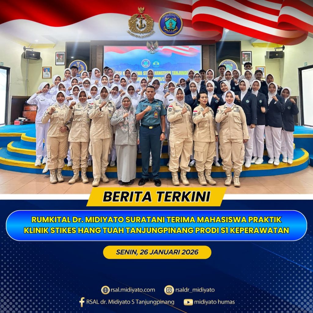 TNI Angkatan Laut. Rumkital dr. Midiyato Suratani melaksanakan kegiatan Penerimaan Praktik Klinik Mahasiswa STIKES Hang Tuah Tanjungpinang Program Studi S1 Keperawatan, bertempat di Gedung Serba Guna (GSG) Pulau Serasan Rumkital dr. Midiyato Suratani, Tanjungpinang, Provinsi Kepri. Senin (26/01/2026)