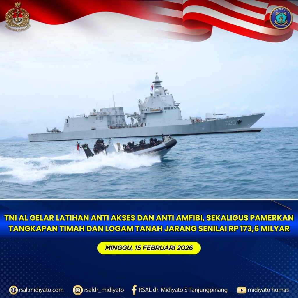 Jakarta, 15 Februari 2026,— TNI AL menggelar Latihan Anti Akses dan Anti Amfibi serta pamerkan tangkapan komoditas logam dan mineral di wilayah Bangka Belitung yang disaksikan langsung oleh Kepala Staf Angkatan Laut (Kasal) Laksamana TNI Dr. Muhammad Ali didampingi Gubernur Prov Kepulauan Bangka Belitung Dr. (HC) Hidayat Arsani, S.E., Minggu (15/2).